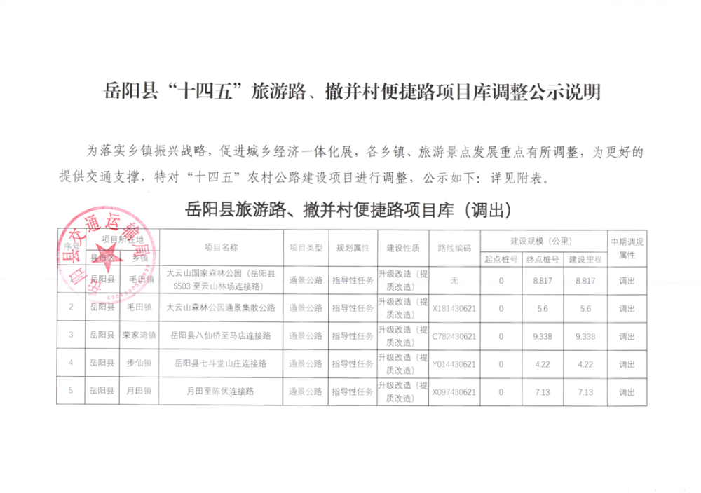 岳陽(yáng)縣“十四五”旅游路、撤并村便捷路項(xiàng)目庫(kù)調(diào)整公示說明