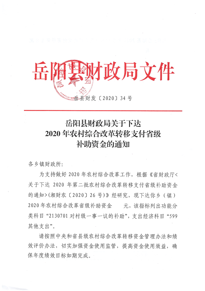 岳陽(yáng)縣下達(dá)2020年農(nóng)村綜合改革轉(zhuǎn)移支付省級(jí)補(bǔ)助資金公開(kāi)