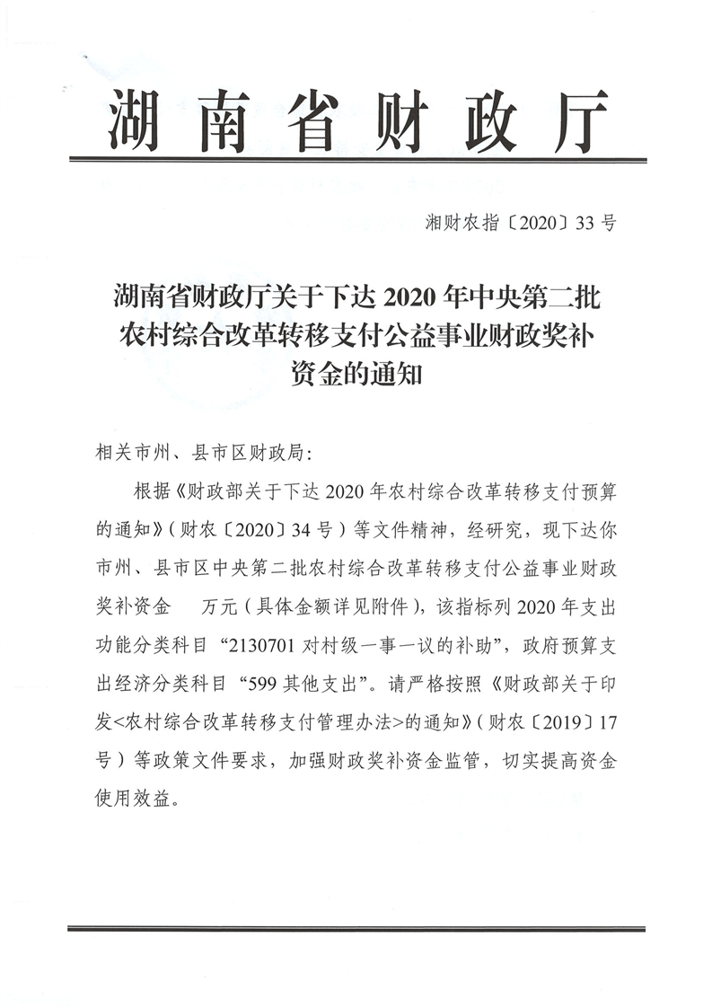 省財(cái)政廳下達(dá)2020年中央第二批農(nóng)村綜合改革轉(zhuǎn)移支付公益事業(yè)財(cái)政獎(jiǎng)補(bǔ)資金公開(kāi)
