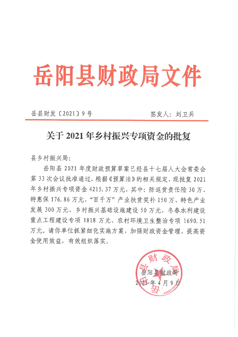 岳陽縣財政局關(guān)于2021年鄉(xiāng)村振興專項資金的批復(fù)