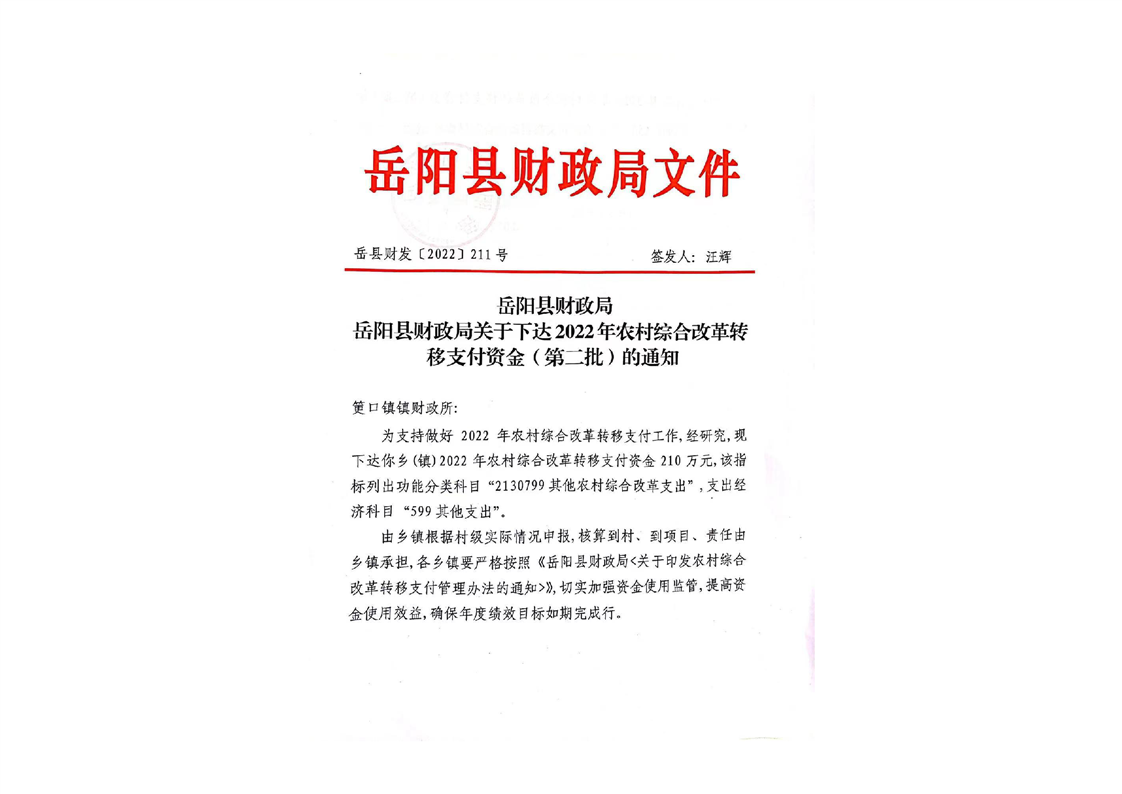 岳陽縣財政局關(guān)于下達2022年農(nóng)村綜合改革轉(zhuǎn)移支付資金(第二批)的通知(岳縣財發(fā)〔2022〕211號)及資金撥付單