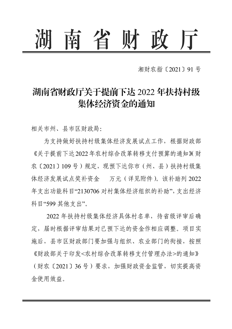 關(guān)于提前下達(dá)2022年扶持村級(jí)集體經(jīng)濟(jì)資金的通知〔2021〕91號(hào))及資金撥付單