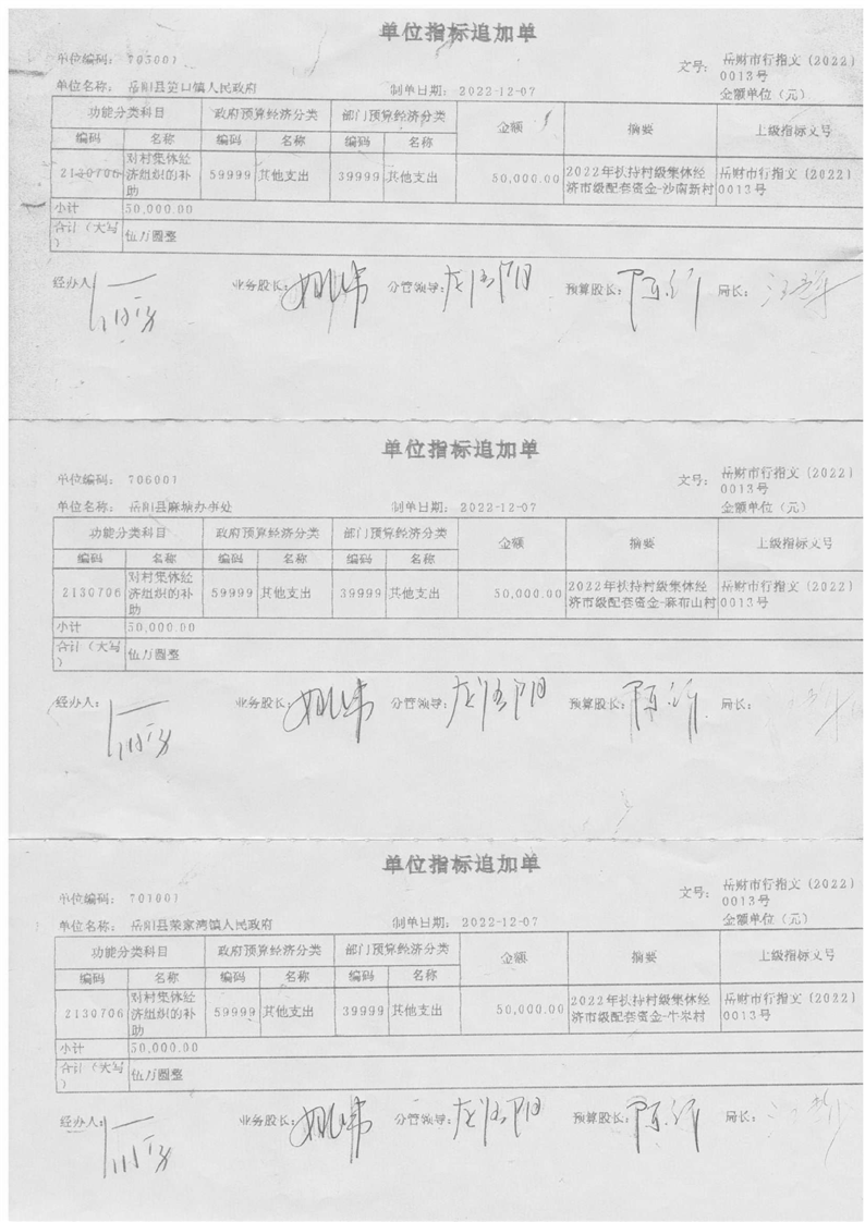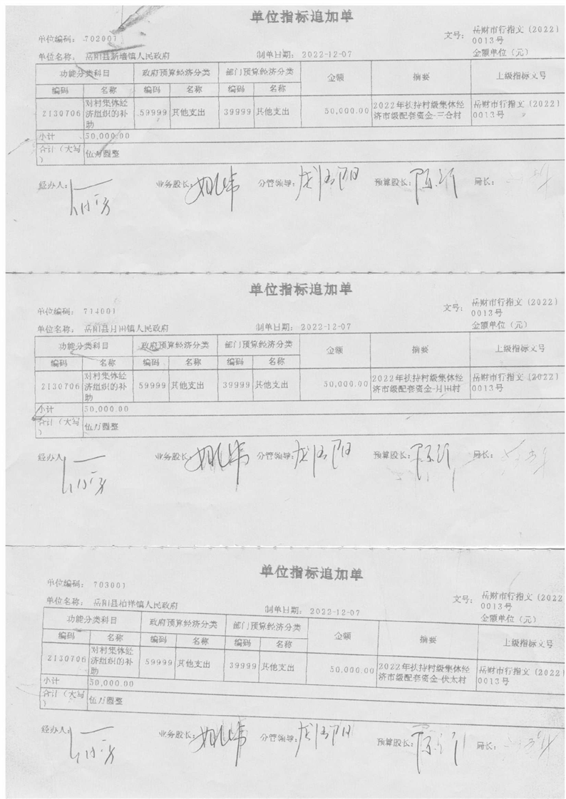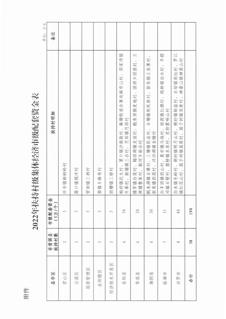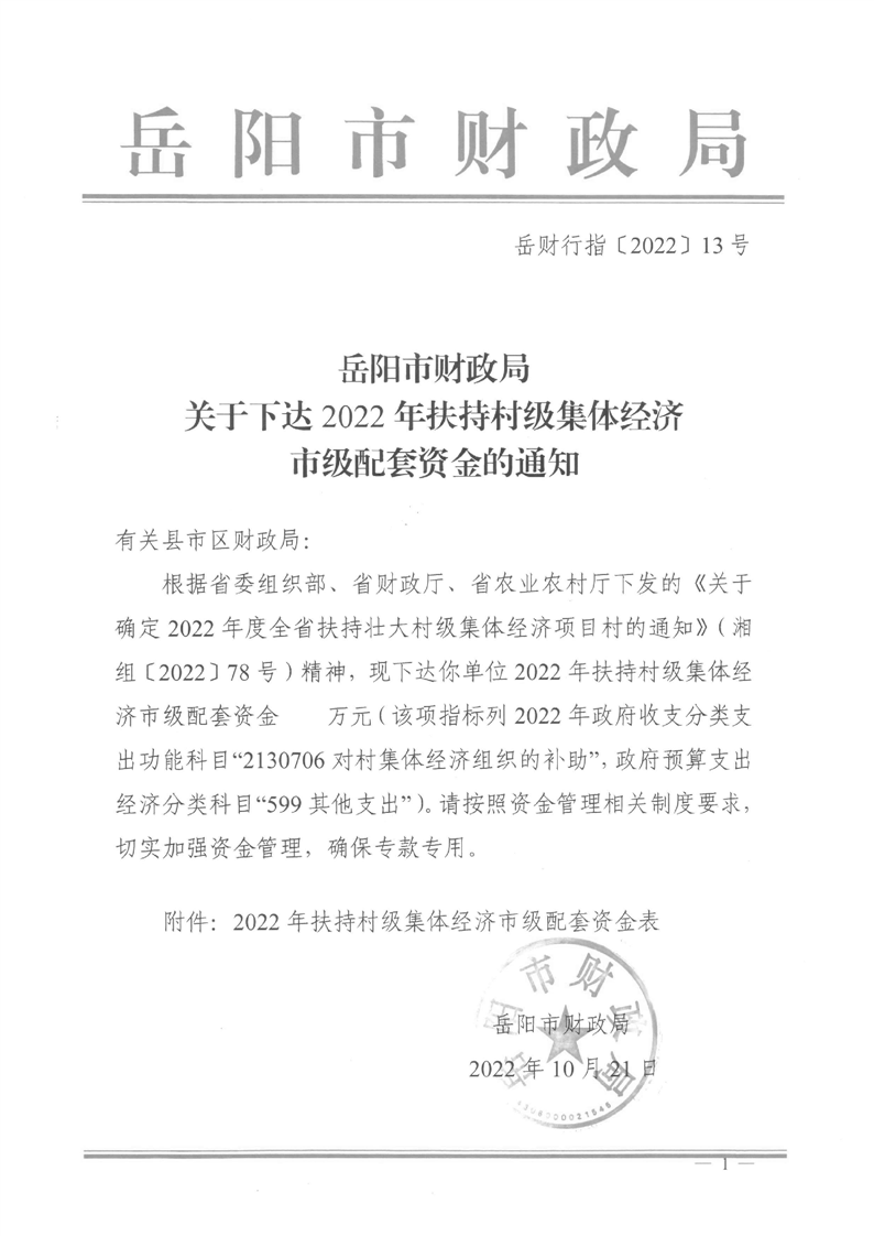 岳陽(yáng)市財(cái)政局關(guān)于下達(dá)2022年扶持村級(jí)集體經(jīng)濟(jì)市級(jí)配套資金的通知(岳財(cái)行指〔2022〕13號(hào))及撥付單