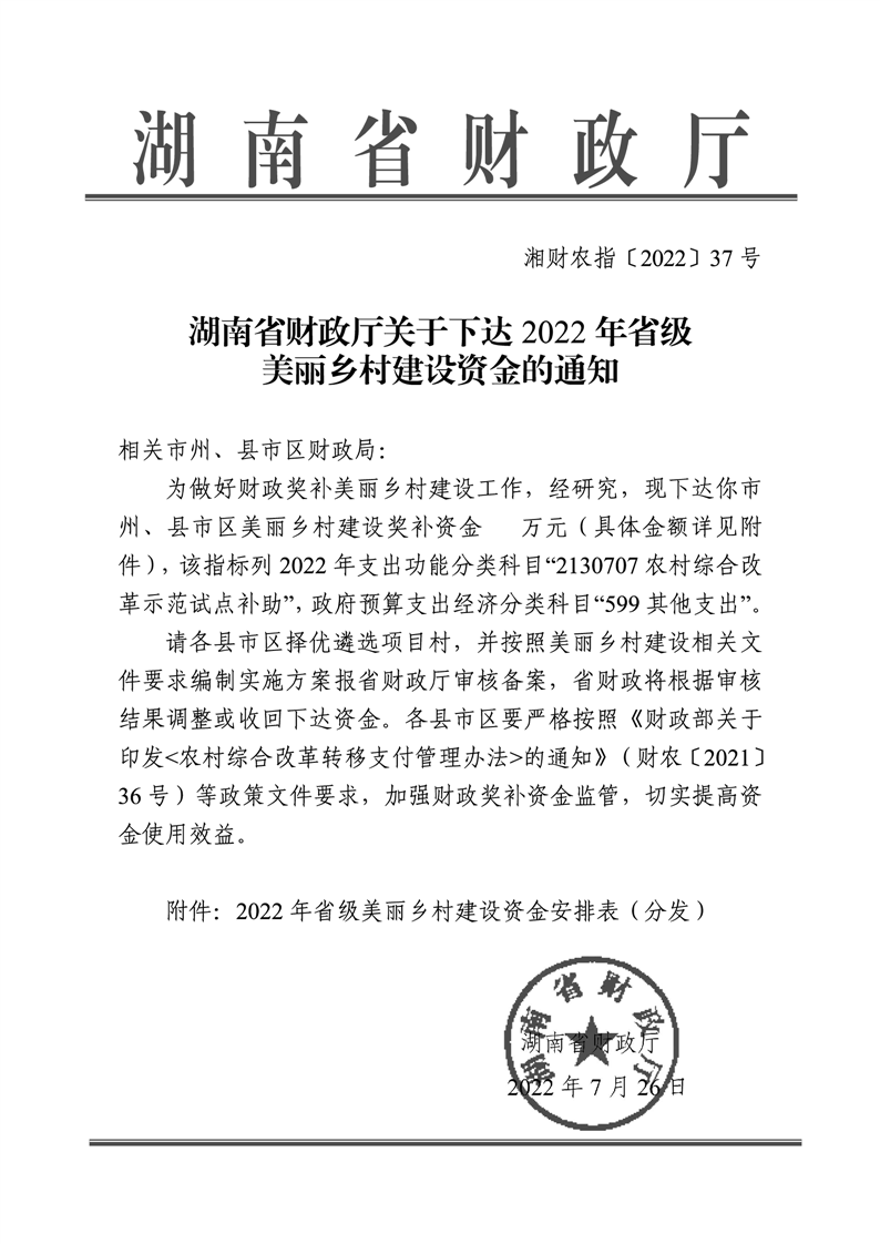 17、湖南省財(cái)政廳關(guān)于下達(dá)2022年省級美麗鄉(xiāng)村建設(shè)資金的通知(湘財(cái)農(nóng)指〔2022〕37號)及資金安排