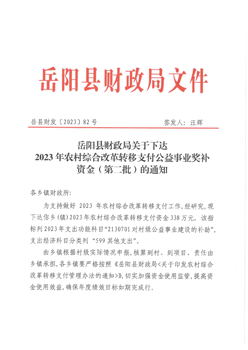 82號岳陽縣財政局關于下達2023年農村綜合改革轉移支付資金(第二批)的通知