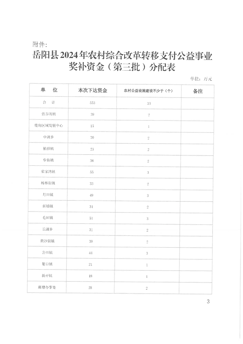 附件:岳陽(yáng)縣2024年農(nóng)村綜合改革轉(zhuǎn)移支付公益事業(yè)獎(jiǎng)補(bǔ)資金(第三批)分配表
