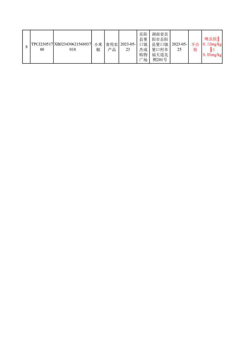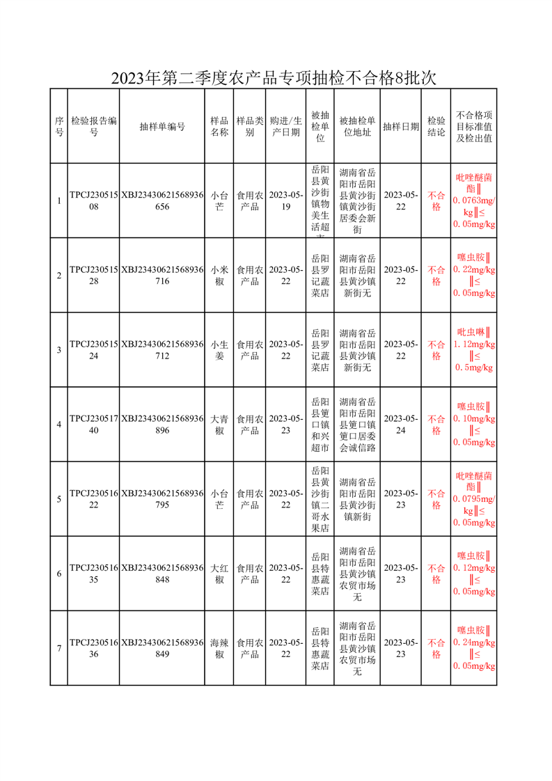 2023年第二季度農(nóng)產(chǎn)品抽檢不合格品(8批次)