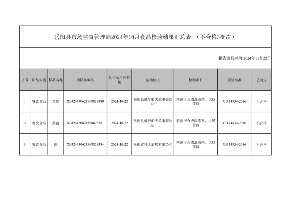 2024年11月27日抽檢數(shù)據(jù)公示(不合格3批次)