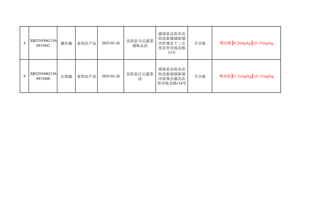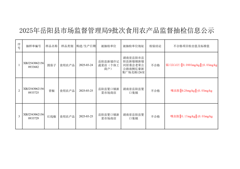 2025年岳陽縣市場監(jiān)督管理局9批次食用農產品監(jiān)督抽檢不合格信息公示(2025年5月12日)