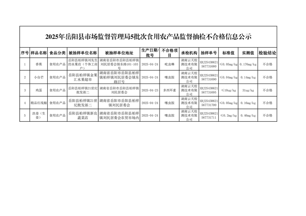2025年6月10日抽檢數(shù)據(jù)公示(不合格5批次)