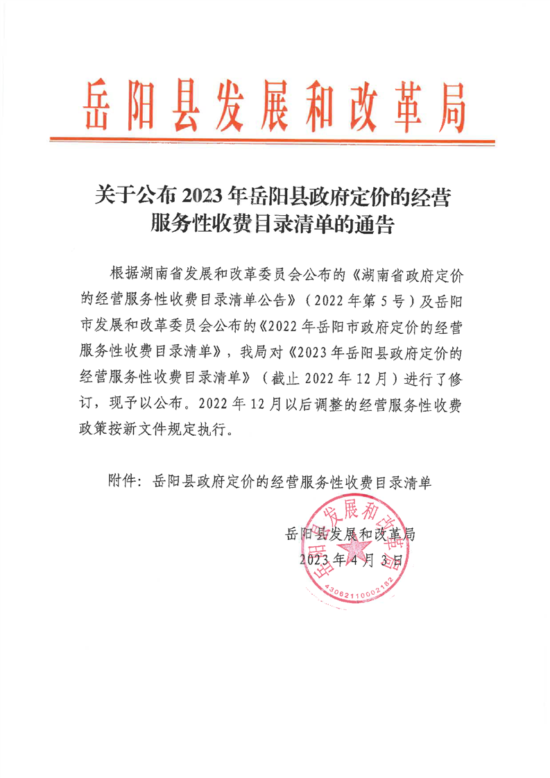 關(guān)于公布2023年岳陽縣政府定價的經(jīng)營服務(wù)性收費(fèi)目錄清單的通告
