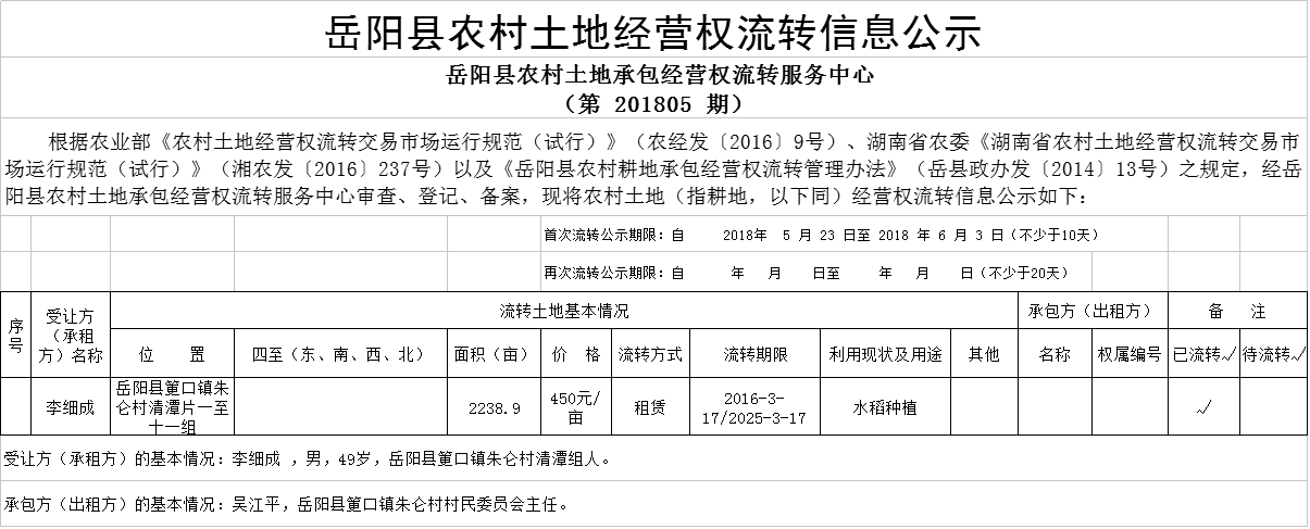岳陽(yáng)縣農(nóng)村土地經(jīng)營(yíng)權(quán)流轉(zhuǎn)信息公示(第201805期)