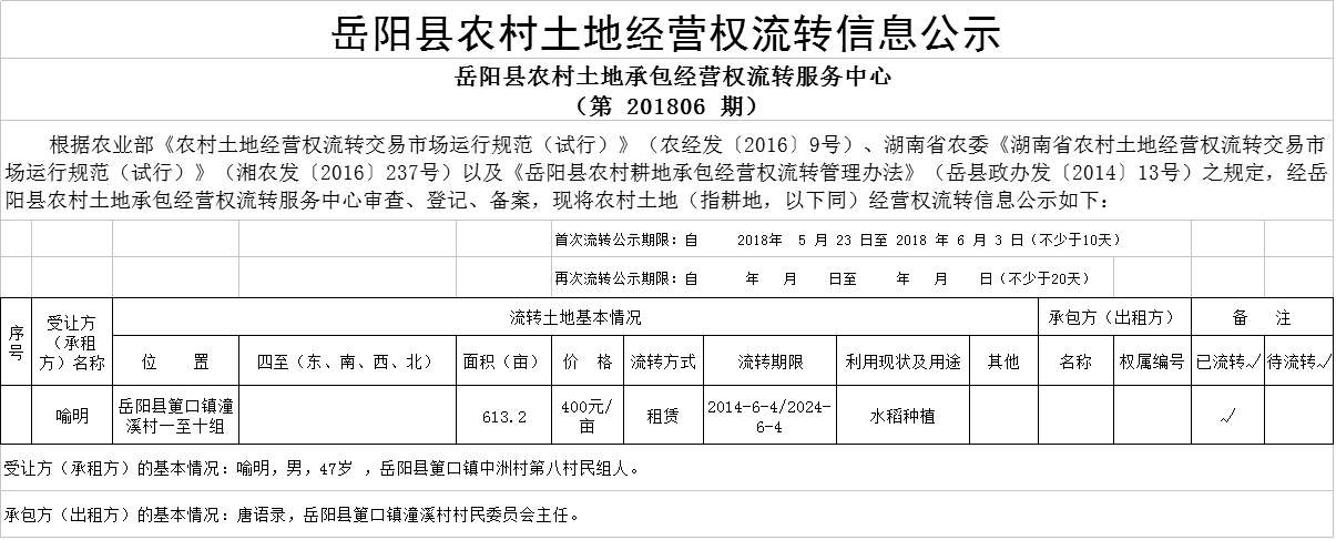 岳陽縣農(nóng)村土地經(jīng)營權(quán)流轉(zhuǎn)信息公示(第201806期)