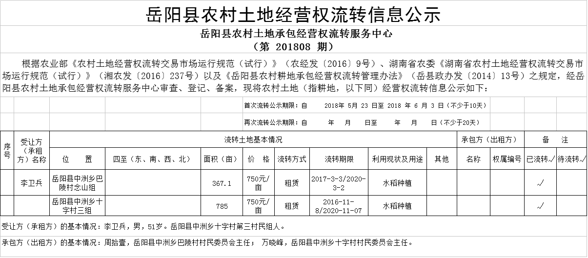 岳陽縣農(nóng)村土地經(jīng)營權(quán)流轉(zhuǎn)信息公示(第201808期)
