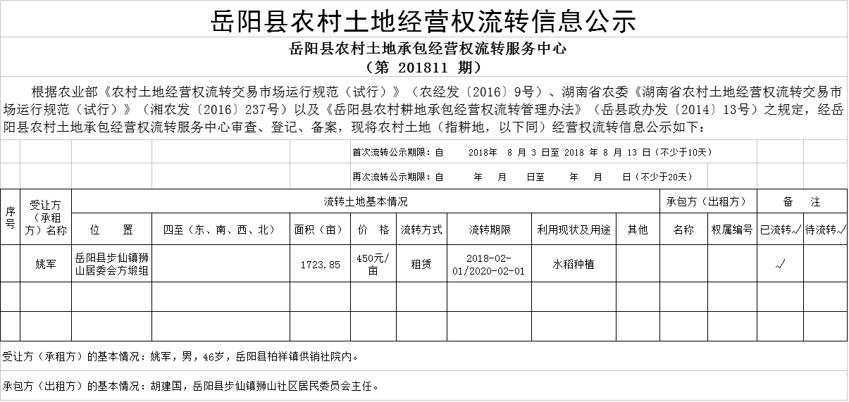 岳陽縣農(nóng)村土地經(jīng)營權(quán)流轉(zhuǎn)信息公示 (第201811期)