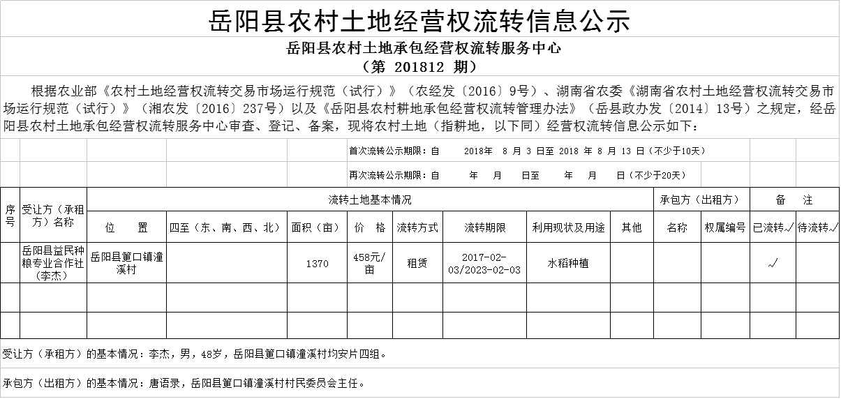 岳陽縣農村土地經營權流轉信息公示(第 201812 期)