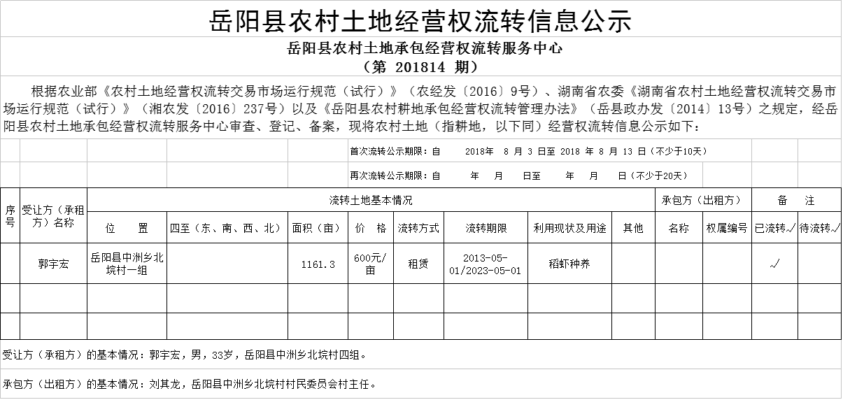岳陽縣農(nóng)村土地經(jīng)營權流轉信息公示(第 201814 期)