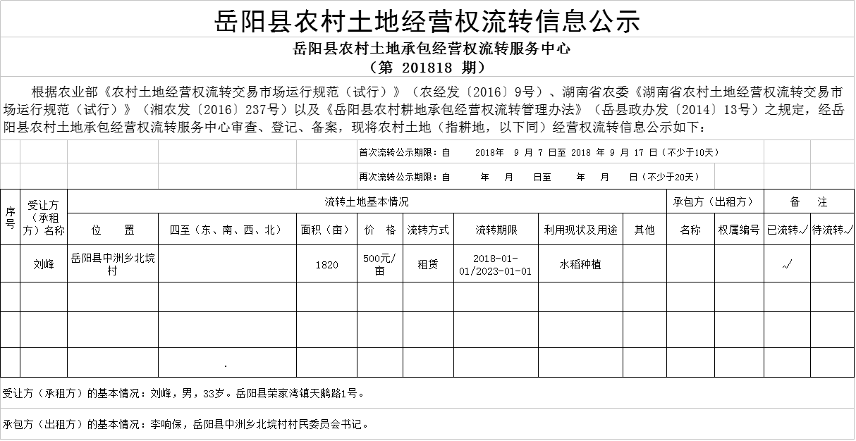 岳陽縣農(nóng)村土地經(jīng)營權(quán)流轉(zhuǎn)信息公示 (第 201818 期)