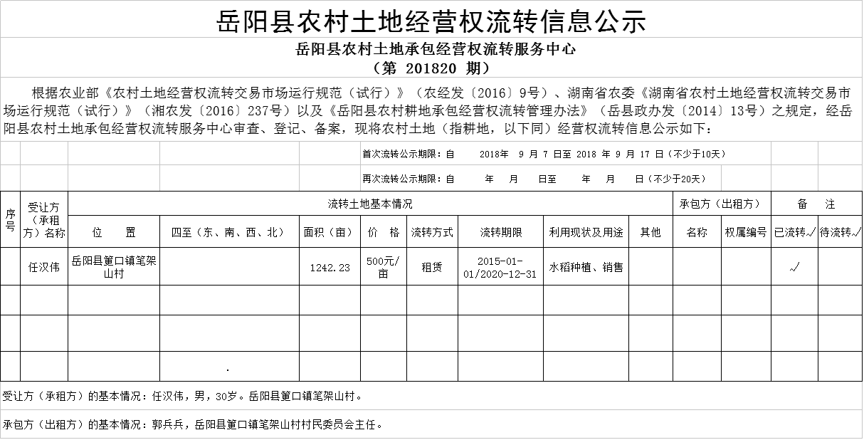 岳陽(yáng)縣農(nóng)村土地經(jīng)營(yíng)權(quán)流轉(zhuǎn)信息公示 (第 201820 期)