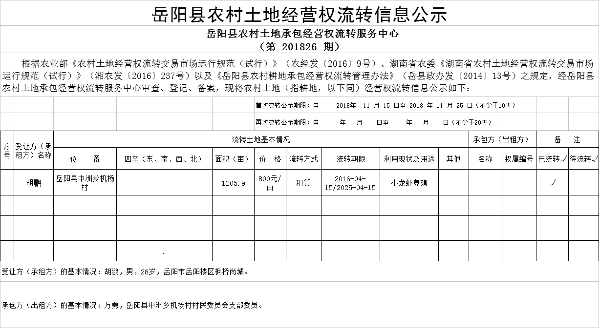 岳陽(yáng)縣農(nóng)村土地經(jīng)營(yíng)權(quán)流轉(zhuǎn)信息公示(第 201826 期)