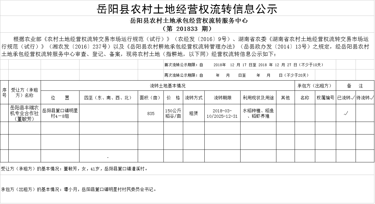 岳陽縣農(nóng)村土地經(jīng)營權流轉信息公示(第 201833 期)