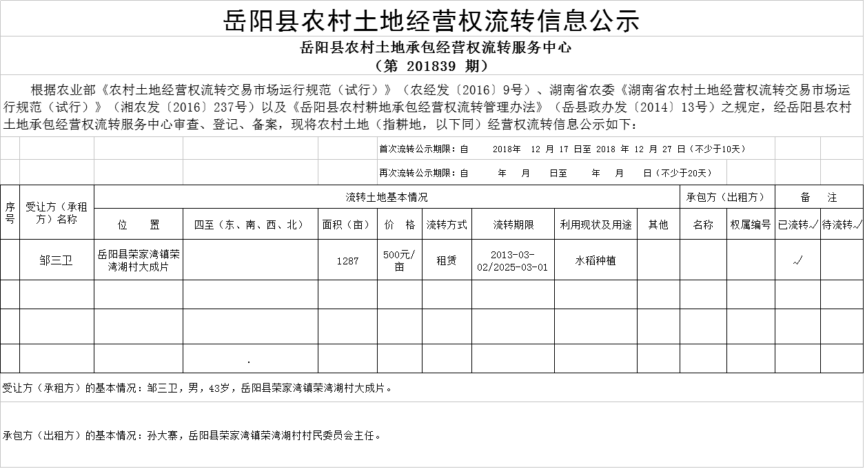 岳陽(yáng)縣農(nóng)村土地經(jīng)營(yíng)權(quán)流轉(zhuǎn)信息公示(第 201839 期)
