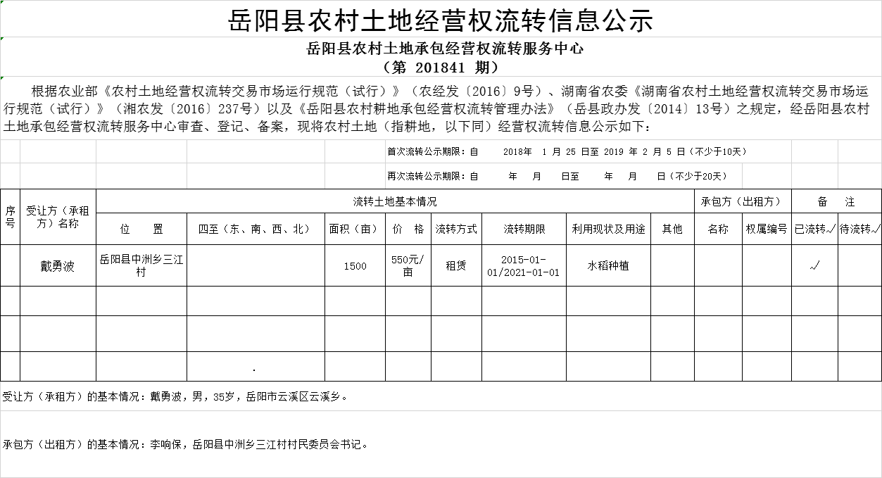 岳陽(yáng)縣農(nóng)村土地經(jīng)營(yíng)權(quán)流轉(zhuǎn)信息公示 (第 201841 期)