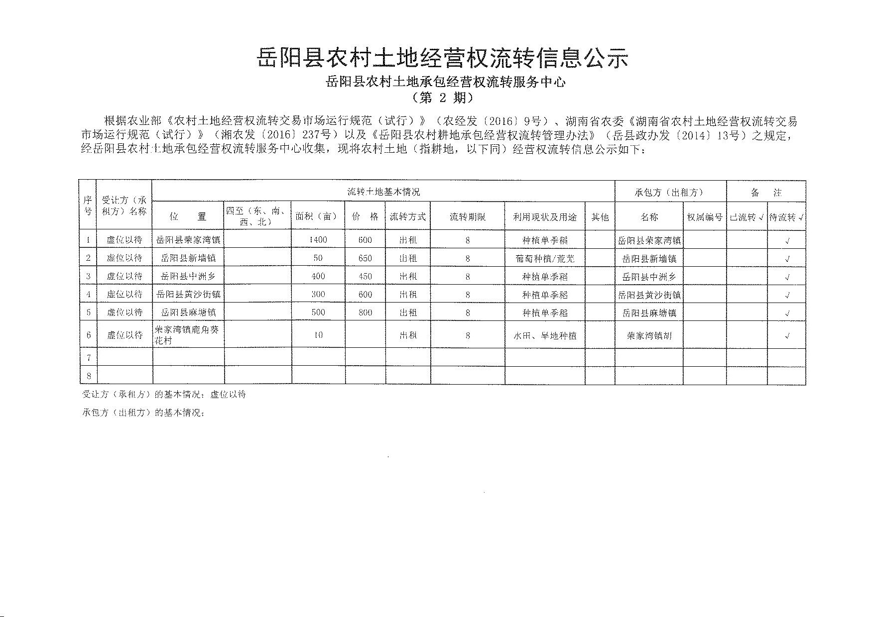 岳陽縣農(nóng)村土地經(jīng)營權(quán)流轉(zhuǎn)信息公示(第2期)