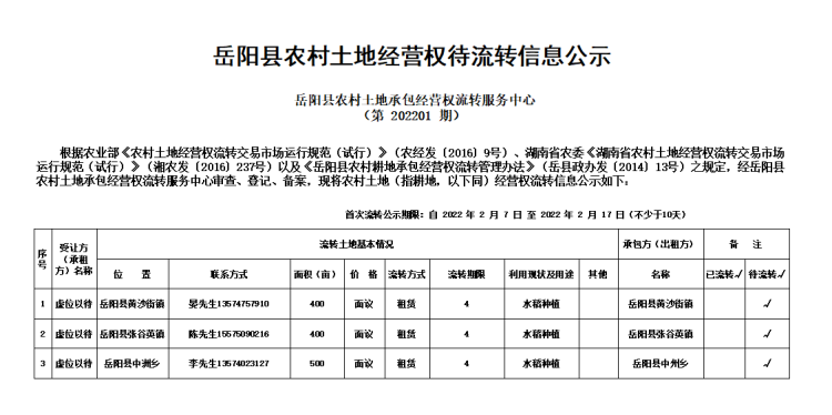 岳陽縣農(nóng)村土地經(jīng)營權(quán)待流轉(zhuǎn)信息公示 (第 202201 期)