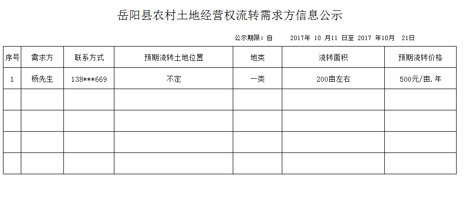 岳陽(yáng)縣農(nóng)村土地經(jīng)營(yíng)權(quán)流轉(zhuǎn)需求方信息公示