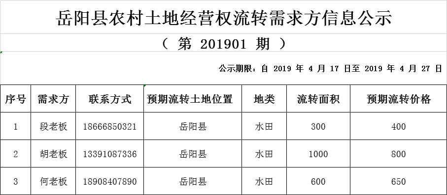 岳陽縣農(nóng)村土地經(jīng)營權(quán)流轉(zhuǎn)需求方信息公示( 第 201901 期 )