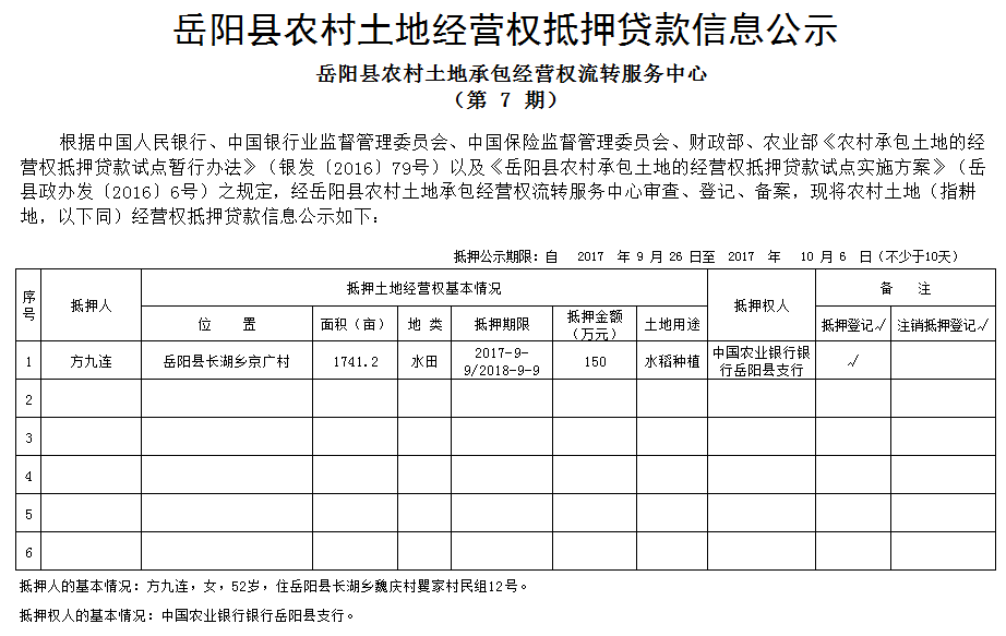 岳陽縣農(nóng)村土地經(jīng)營權(quán)抵押貸款信息公示(第7期)