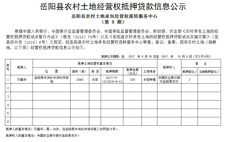 岳陽縣農(nóng)村土地經(jīng)營權(quán)抵押貸款信息公示(第9期)