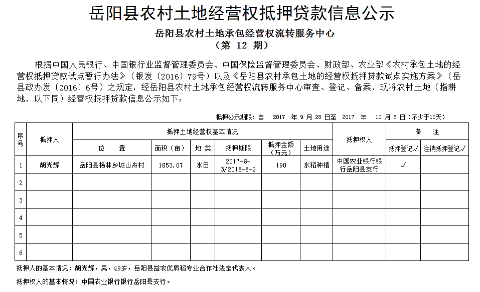 岳陽(yáng)縣農(nóng)村土地經(jīng)營(yíng)權(quán)抵押貸款信息公示(第12期)
