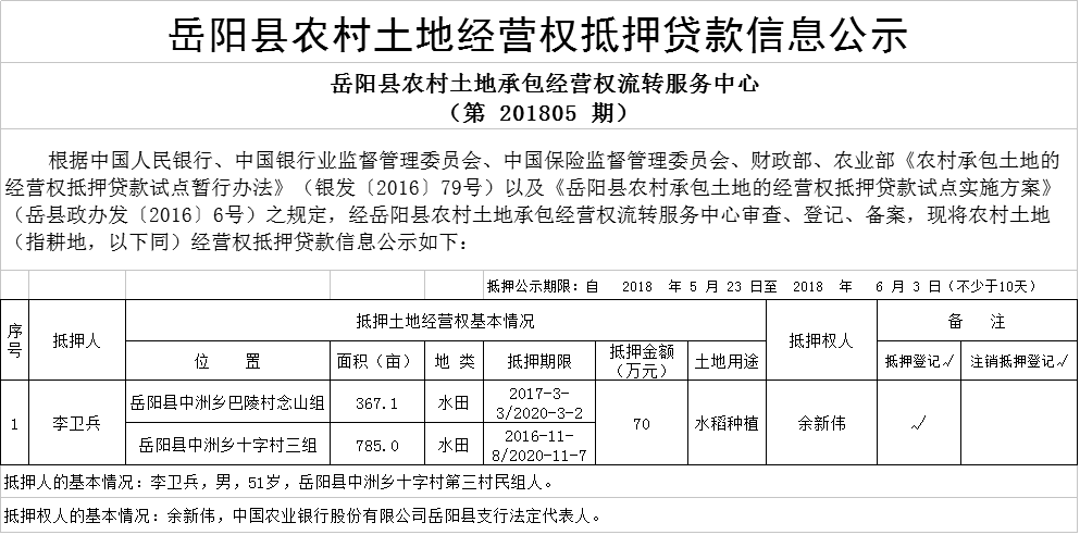 岳陽縣農(nóng)村土地經(jīng)營權(quán)抵押貸款信息公示(第201805期)