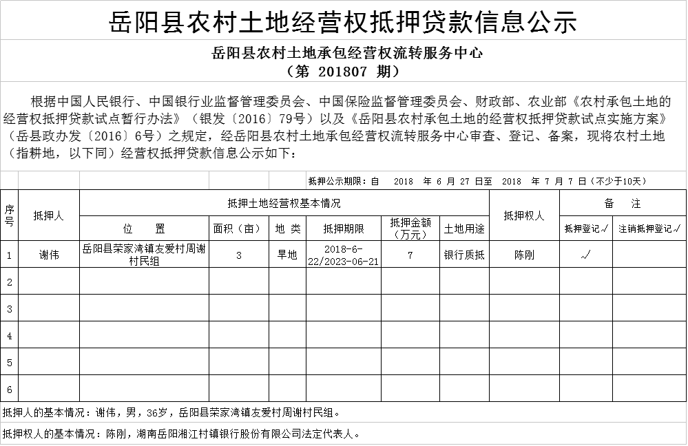 岳陽(yáng)縣農(nóng)村土地經(jīng)營(yíng)權(quán)抵押貸款信息公示(第201807期)