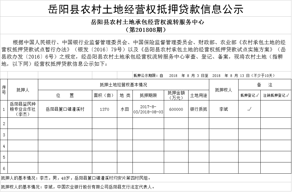 岳陽縣農(nóng)村土地經(jīng)營權(quán)抵押貸款信息公示 (第201808期)