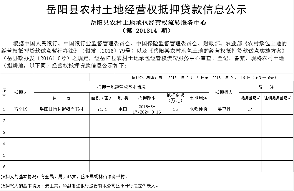 岳陽(yáng)縣農(nóng)村土地經(jīng)營(yíng)權(quán)抵押貸款信息公示(第 201814 期)
