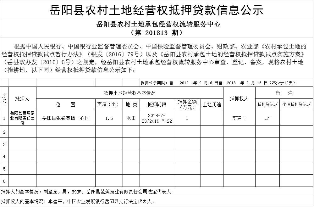 岳陽縣農村土地經營權抵押貸款信息公示 (第 201813 期)