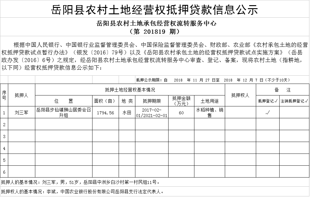 岳陽縣農(nóng)村土地經(jīng)營權(quán)抵押貸款信息公示(第 201819 期)