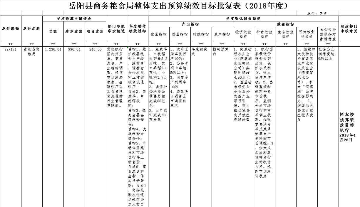 岳陽縣商務(wù)糧食局整體支出預(yù)算績(jī)效目標(biāo)批復(fù)表