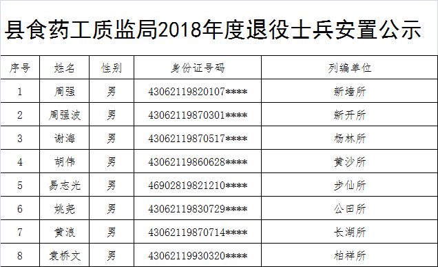 縣食藥工質(zhì)監(jiān)局2018年度退役士兵安置公示