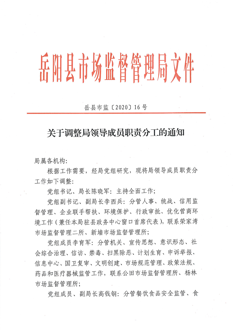 關(guān)于調(diào)整局領(lǐng)導(dǎo)成員職責(zé)分工的通知