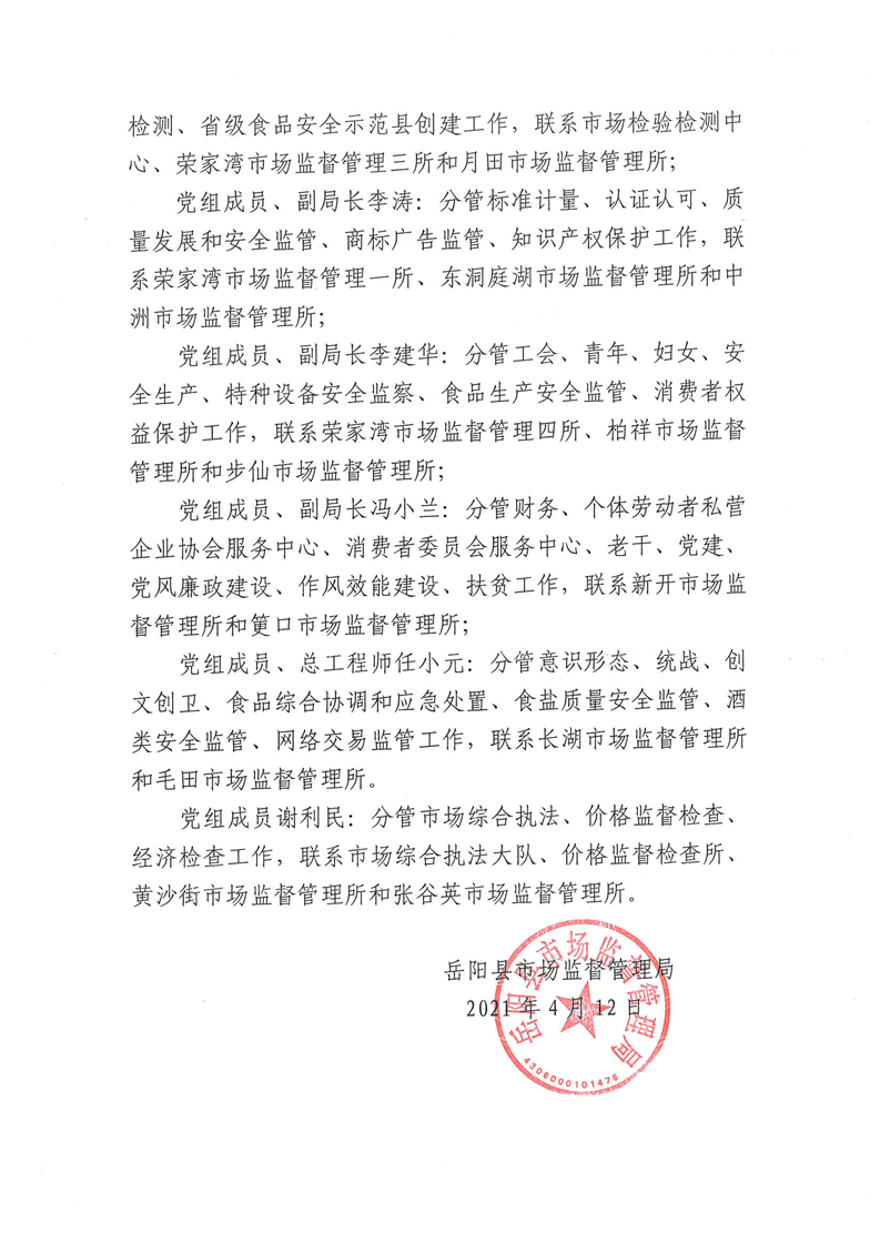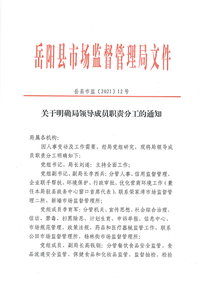 岳縣市監(jiān)〔2021〕12號(hào)關(guān)于明確局領(lǐng)導(dǎo)成員職責(zé)分工的通知