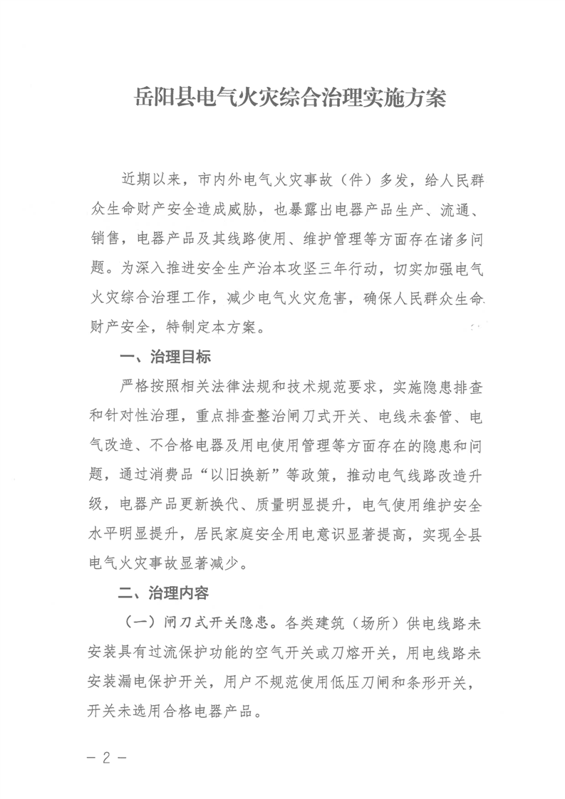 岳陽縣電氣火災綜合治理實施方案
