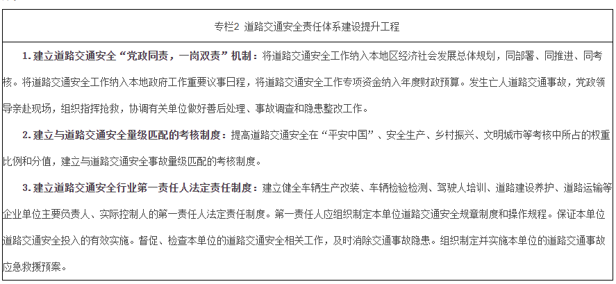 建立健全各級(jí)道路交通安全工作協(xié)調(diào)機(jī)制,堅(jiān)持黨政同責(zé)、一崗雙責(zé)、齊抓共管、失職追責(zé),落實(shí)黨政領(lǐng)導(dǎo)干部道路交通安全責(zé)任制,推行道路交通死亡事故黨政領(lǐng)導(dǎo)到場(chǎng)制度。加大道路交通安全在“平安中國(guó)”、安全生產(chǎn)、鄉(xiāng)村振興、文明城市等考核中的權(quán)重,建立量級(jí)匹配的考核制度,真正形成責(zé)任全覆蓋、管理全方位、過(guò)程全監(jiān)管的道路交通安全綜合治理格局。建立道路交通安全部門協(xié)作責(zé)任制,明確監(jiān)管責(zé)任,細(xì)化責(zé)任清單,完善監(jiān)管鏈條,真正形成監(jiān)管合力。建立健全道路交通安全隱患排查治理體系,健全全鏈條、可追溯的管理機(jī)制。