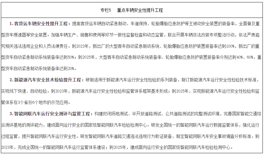 強(qiáng)化標(biāo)準(zhǔn)引領(lǐng),修訂機(jī)動(dòng)車運(yùn)行安全國(guó)家標(biāo)準(zhǔn),研究制定經(jīng)營(yíng)性機(jī)動(dòng)車運(yùn)營(yíng)安全國(guó)家標(biāo)準(zhǔn),推進(jìn)客貨運(yùn)車輛輔助安全、主被動(dòng)安全標(biāo)準(zhǔn)升級(jí)。提升載客汽車安全要求,提升客運(yùn)車輛阻燃性能水平,提高客運(yùn)車輛安全逃生要求;提升車高大于或等于1850mm的小微型普通客車、面包車安全性能,減少非法改裝和超載空間;實(shí)行公路客運(yùn)、旅游客運(yùn)車輛全環(huán)節(jié)、全鏈條安全管理,鼓勵(lì)地方政府實(shí)施在用大中型客車安全性提升行動(dòng),依法推動(dòng)不符合車輛安全技術(shù)條件要求、達(dá)到報(bào)廢標(biāo)準(zhǔn)的臥鋪客車、57座以上大客車等退出市場(chǎng),推動(dòng)客運(yùn)車輛安裝乘員不系安全帶報(bào)警裝置。提升載貨汽車安全要求,推動(dòng)重型貨車嚴(yán)格按照相關(guān)標(biāo)準(zhǔn)裝備車道偏離預(yù)警系統(tǒng)和車輛前向碰撞預(yù)警系統(tǒng),嚴(yán)格自卸半掛車、平板式清障車等違規(guī)情形較多車型的安全技術(shù)規(guī)范,提升輕型貨車被動(dòng)安全性能,制定實(shí)施載貨車輛貨物裝載與栓固國(guó)家標(biāo)準(zhǔn),提高常壓液體危險(xiǎn)貨物罐式車輛罐體防撞、防漏性能,推動(dòng)低平板掛車退出散貨運(yùn)輸市場(chǎng),推動(dòng)在用重型貨車安裝右側(cè)盲區(qū)消除預(yù)警裝置等安全裝置。提高客貨運(yùn)車輛主被動(dòng)安全裝置裝備率,推廣應(yīng)用智能視頻監(jiān)控報(bào)警技術(shù),重型貨車全面普及緩速器等安全裝置,加強(qiáng)中置軸掛車列車、雙掛汽車列車等新型汽車列車車型運(yùn)行安全研究,探索駕駛行為動(dòng)態(tài)監(jiān)測(cè)裝置等輔助安全裝置應(yīng)用,研究在“兩客一!、貨車等重點(diǎn)車型安裝應(yīng)用酒精鎖。提升新能源汽車安全要求,構(gòu)建新能源汽車運(yùn)行安全性檢驗(yàn)技術(shù)及裝備體系,強(qiáng)化新能源汽車運(yùn)行安全性檢驗(yàn)和監(jiān)管,嚴(yán)格規(guī)范遠(yuǎn)程升級(jí)要求,保障車輛行駛安全性。
