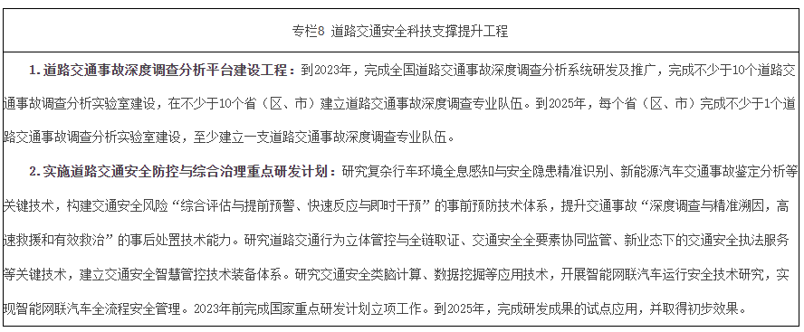 健全產(chǎn)、學(xué)、研、用深度融合的協(xié)同創(chuàng)新機(jī)制,形成行業(yè)需求引領(lǐng)、有效分工協(xié)作、科技創(chuàng)新支撐的新格局。深化道路交通全要素協(xié)同管控理論及技術(shù)研究,建構(gòu)滿足道路交通安全高質(zhì)量發(fā)展的國(guó)家技術(shù)標(biāo)準(zhǔn)體系,做好交通安全科技頂層設(shè)計(jì)。匯聚各類創(chuàng)新成果,促進(jìn)道路交通安全科技成果在交通安全治理中的應(yīng)用推廣。健全道路交通事故深度調(diào)查技術(shù)支撐體系,建設(shè)全國(guó)道路交通事故深度調(diào)查分析系統(tǒng),建立道路交通事故深度調(diào)查專業(yè)隊(duì)伍,推動(dòng)在全國(guó)范圍內(nèi)建設(shè)道路交通事故調(diào)查分析實(shí)驗(yàn)室。推動(dòng)部門層面共享涉及輔助駕駛、自動(dòng)駕駛相關(guān)事故數(shù)據(jù)。