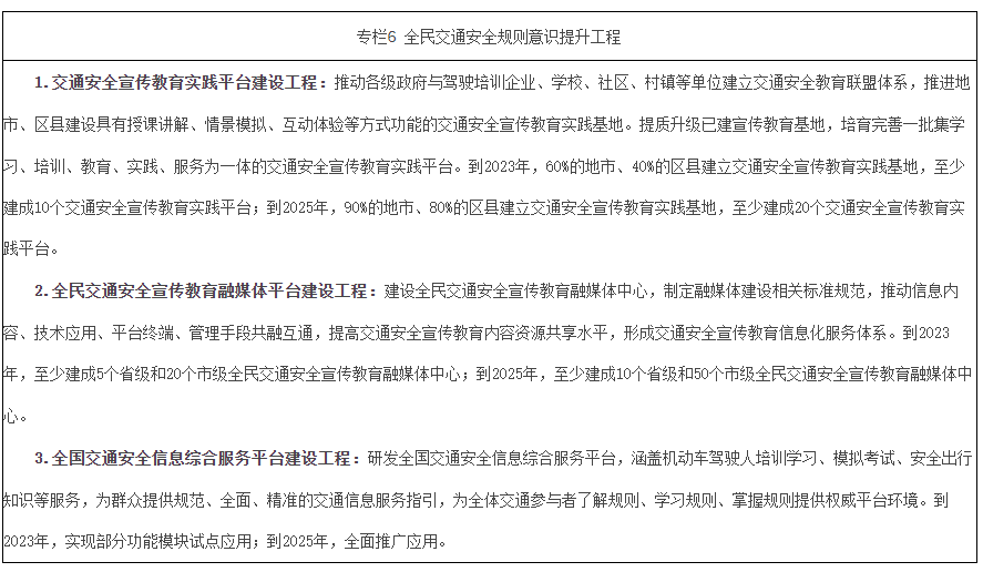 完善駕駛培訓(xùn)監(jiān)管機(jī)制,強(qiáng)化駕駛培訓(xùn)機(jī)構(gòu)落實(shí)教學(xué)基礎(chǔ)設(shè)施設(shè)備、培訓(xùn)學(xué)時(shí)內(nèi)容等要求,保證駕駛培訓(xùn)質(zhì)量。健全完善駕駛培訓(xùn)教學(xué)體系,推動(dòng)理論培訓(xùn)方式創(chuàng)新應(yīng)用,強(qiáng)化駕駛?cè)税踩R(shí)、規(guī)則意識(shí)、風(fēng)險(xiǎn)辨識(shí)能力培養(yǎng)。加強(qiáng)駕駛培訓(xùn)過(guò)程監(jiān)管,強(qiáng)化駕駛培訓(xùn)與考試的信息共享。加強(qiáng)駕駛考試過(guò)程監(jiān)管,建立以新駕駛?cè)税踩{駛水平為核心的考試質(zhì)量評(píng)估體系,實(shí)行嚴(yán)重交通事故駕駛?cè)丝荚嚢l(fā)證責(zé)任倒查。優(yōu)化駕駛?cè)丝荚噧?nèi)容與方法,完善面向規(guī)則意識(shí)培育的駕駛?cè)丝荚嚈C(jī)制,探索VR、人工智能等新技術(shù)在駕駛考試管理中的應(yīng)用。主動(dòng)適應(yīng)人口老齡化、車輛智能化等社會(huì)發(fā)展需求,豐富車輛新技術(shù)、駕駛新要求等考核內(nèi)容。健全完善職業(yè)駕駛?cè)私逃嘤?xùn)體系,提升重點(diǎn)駕駛?cè)税踩芾硭健=⒔煌ò踩畔⒕C合服務(wù)平臺(tái),提供駕駛?cè)巳芷、全分類群體、全出行場(chǎng)景的交通安全知識(shí)服務(wù)。