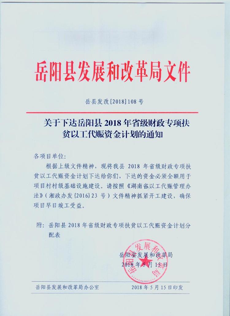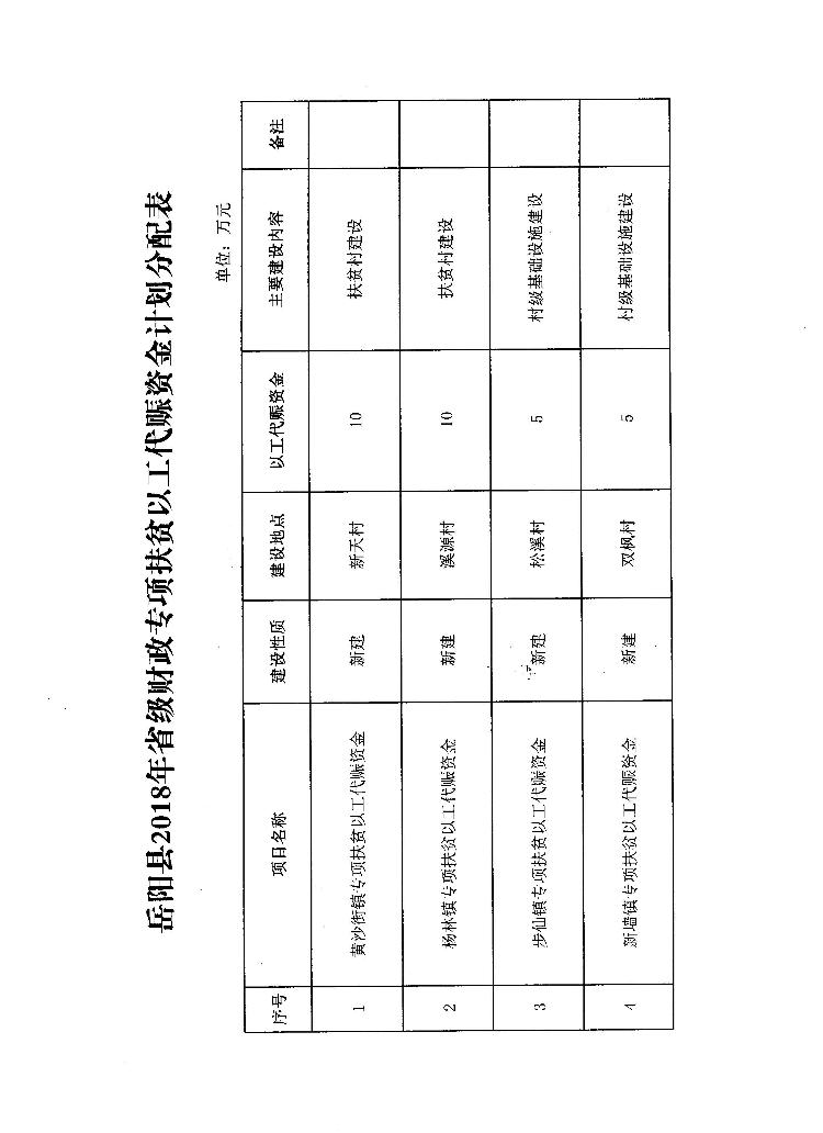 關(guān)于下達岳陽縣2018年省級財政專項扶貧以工代賑資金計劃的通知